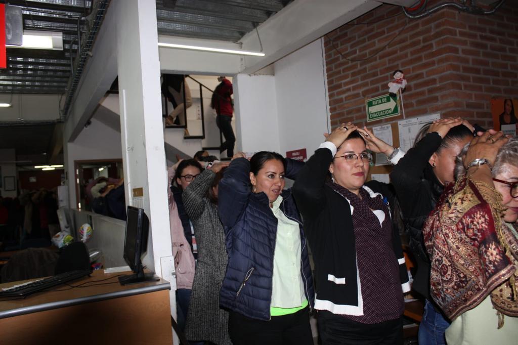 Para este fin, las alarmas sísmicas fueron activadas manualmente en punto de las 11 horas, acto seguido, se activaron los protocolos y de manera ordenada, las y los trabajadores abandonaron sus oficinas para salir del edificio y resguardarse en zona segura.